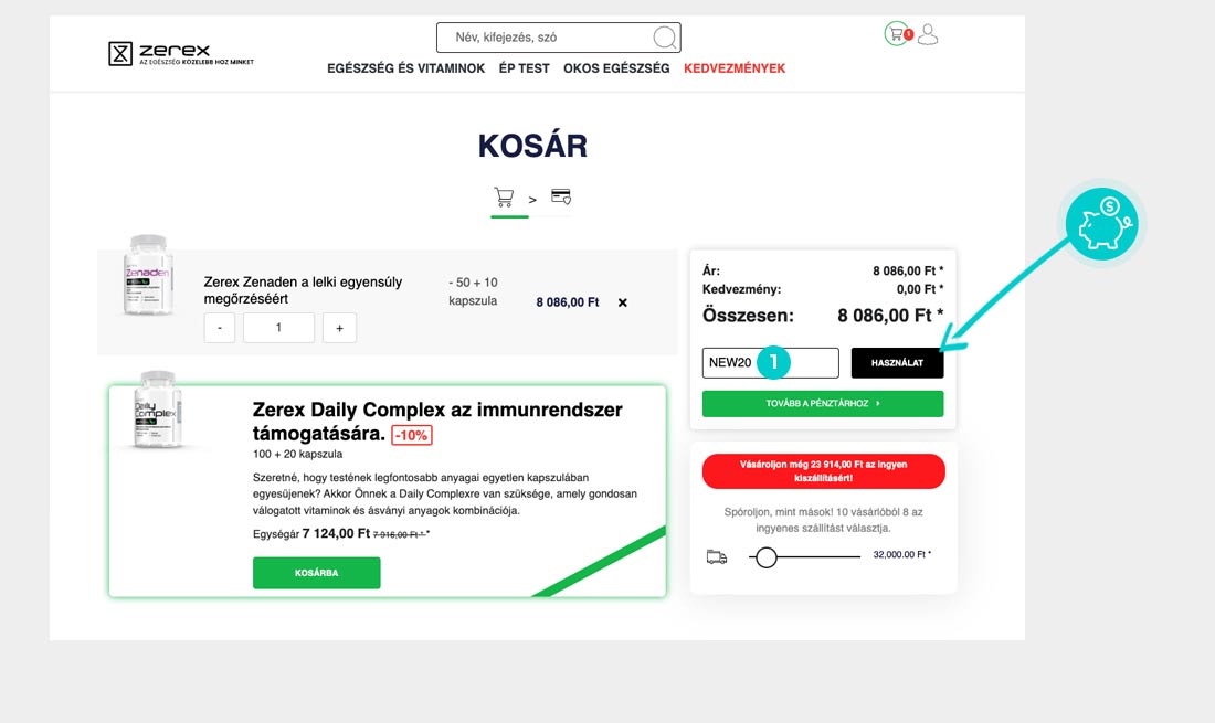 Válaszd ki a webáruházban a kívánt terméket, majd kattints a „Kosárba helyez” gombra és termék automatikusan a bevásárlókosárba kerül. A bevásárlókosárban a kiválasztott termékek alatt találod az "Az ajándékkupon vagy a kedvezmény kódja" ablakot. Itt megadhatod a kedvezménykódot a kód bemásolásával, vagy manuálisan beírva, majd érvényesítsd az „OK” gombbal.